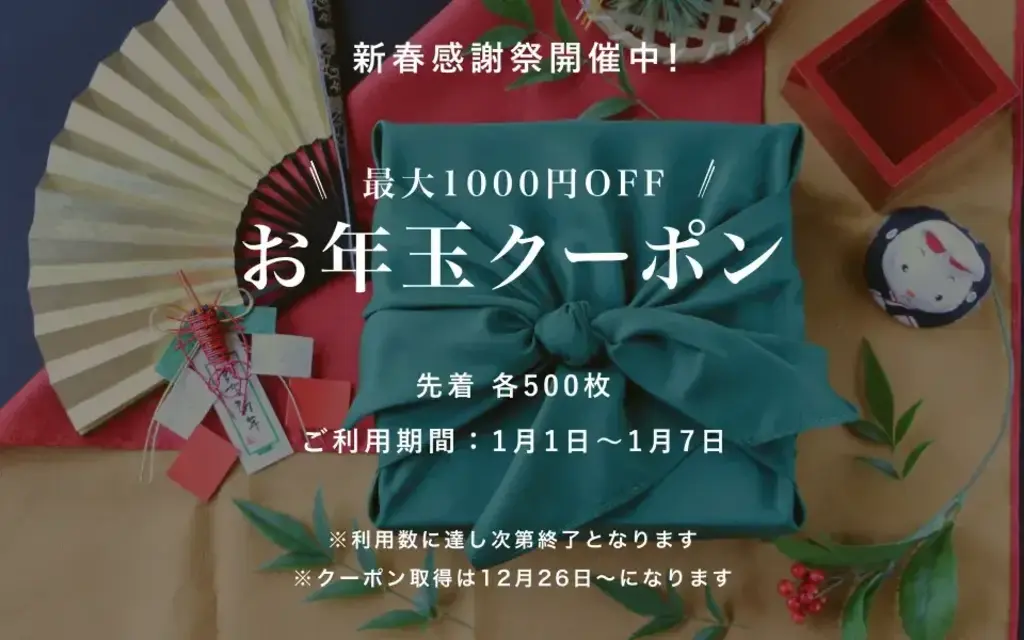 期間限定で全商品対象のお年玉クーポンプレゼント中。ぜひご利用下さい。