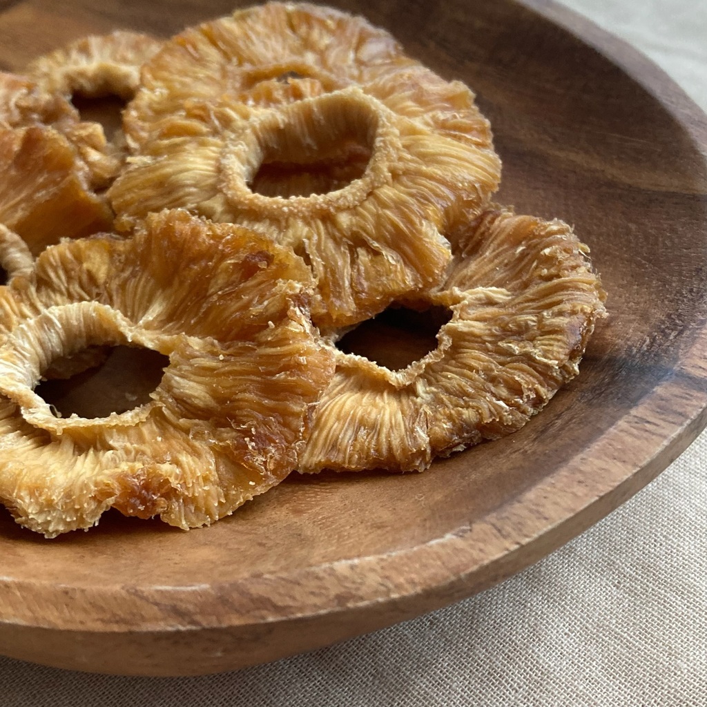 《有機パイナップル》 有機栽培されたタイ産の完熟パイナップル(パタビア種)の皮をむきスライスして、そのまま乾燥しました。凝縮された甘みと爽やかな酸味、パイナップル本来の自然な香味が広がります。有機JAS認証取得品。