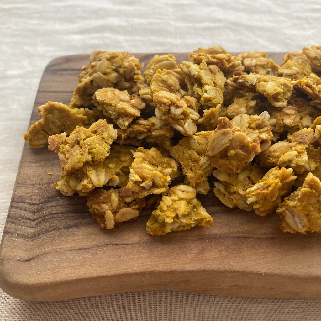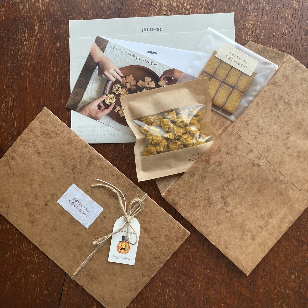 【原材料】:有機オートミール(有機オーツ麦(アメリカ産))、栽培期間中農薬不使用かぼちゃ(北海道産)、栽培期間中農薬不使用米粉(米(京都産))、有機ココナッツオイル(フィリピン産)、自然海塩(五島列島)