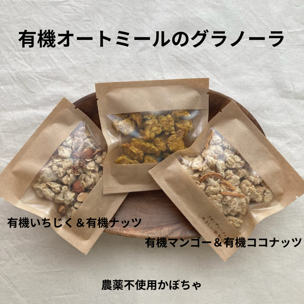 【原材料】 有機オートミール(有機オーツ麦(アメリカ産))、栽培期間中農薬不使用かぼちゃ(北海道産)、栽培期間中農薬不使用米粉(米(京都産))、有機ココナッツオイル(フィリピン産)、自然海塩(五島列島)