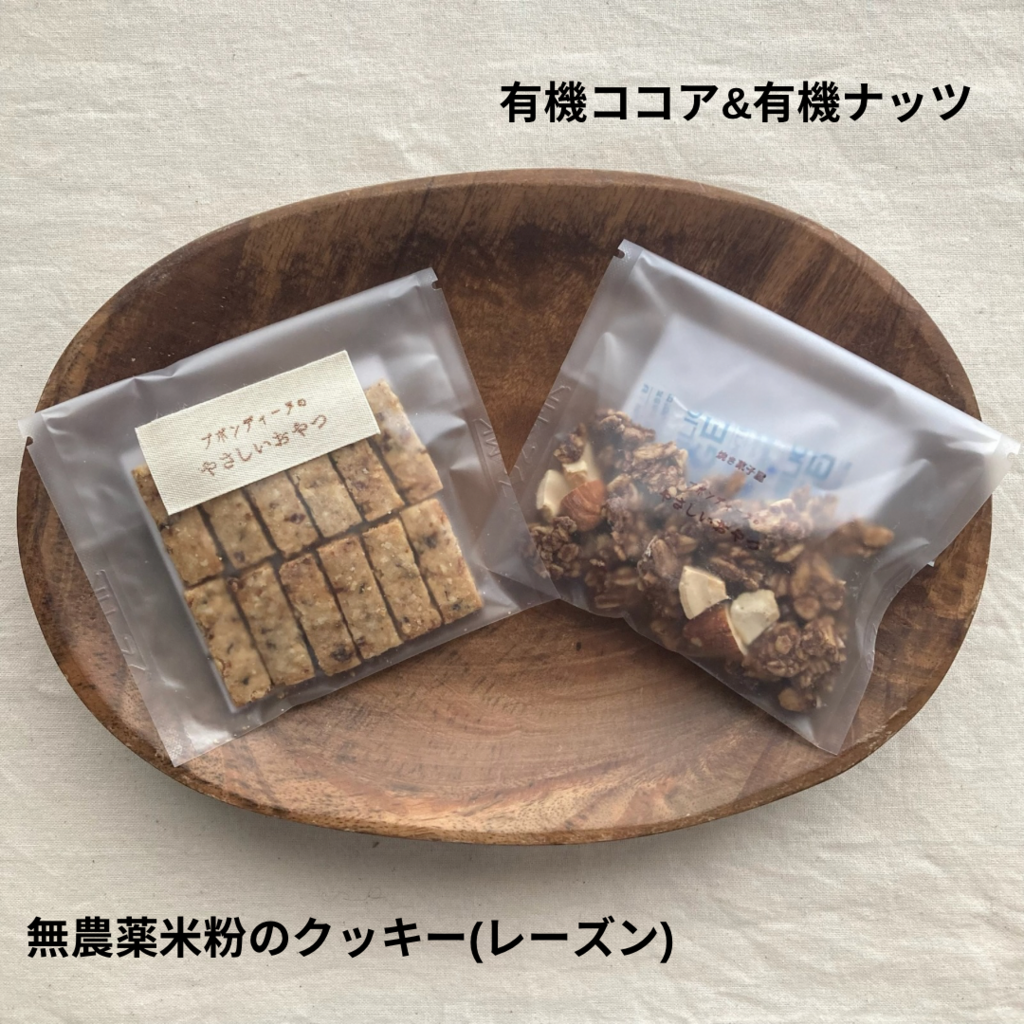 【原材料】 栽培期間中農薬不使用米粉(米(京都産))、有機レーズン(トルコ産)、有機オートミール(アメリカ産)、有機片栗粉(北海道産)、有機アーモンドプードル(アメリカ産)、有機ココナッツオイル(フィリピン産)、菜種油(農薬不使用菜種(熊本県産))、自然海塩(長崎県五島列島)、(一部にアーモンドを含む)
