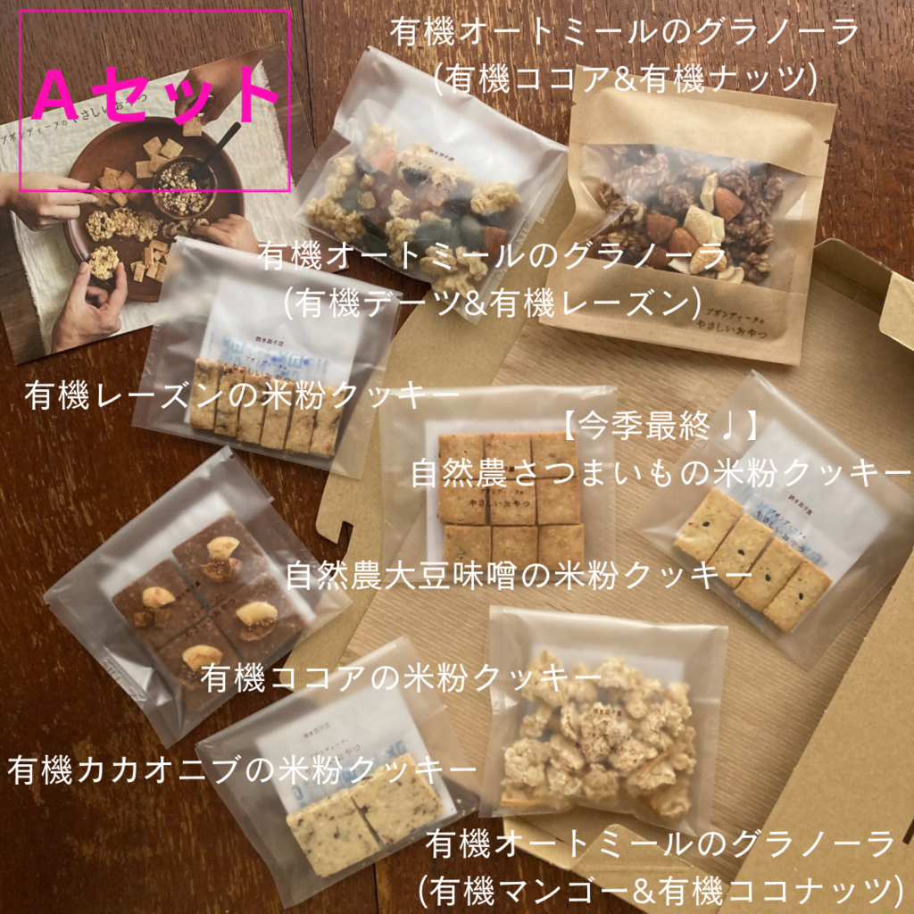 【原材料】 栽培期間中農薬不使用さつまいも(熊本県産)、栽培期間中農薬不使用米粉(米(京都産))、有機オートミール(アメリカ産)、有機ココナッツオイル(フィリピン産)、有機アーモンドプードル(アメリカ産)、自然海塩(長崎県五島列島)、有機黒ごま(鳥取県産)、(一部にアーモンド、ごまを含む)