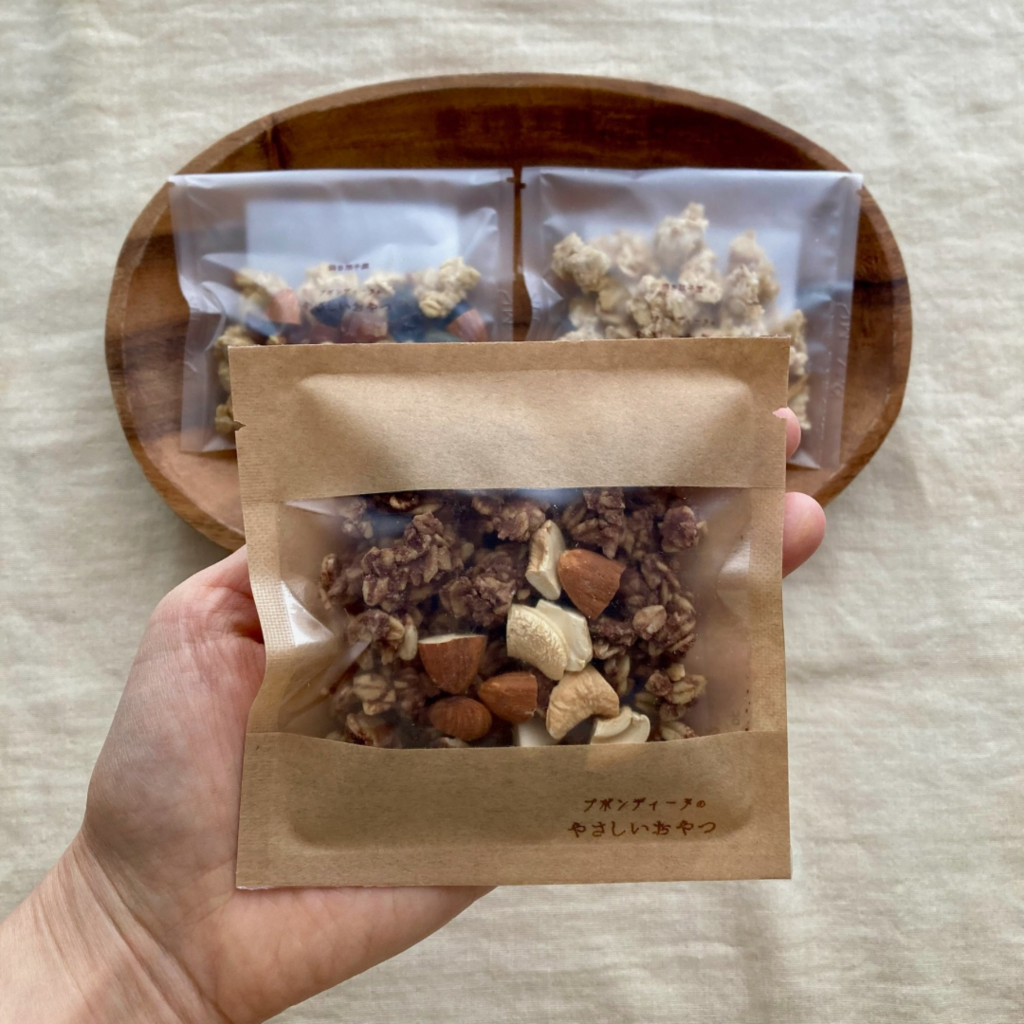 【原材料】 有機オートミール(有機オーツ麦(アメリカ産))、栽培期間中農薬不使用米粉(米(京都産))、有機ココナッツオイル(フィリピン産)、有機アーモンド(アメリカ産)、有機カシューナッツ(インド産)、有機ひまわりの種(ブルガリア産)、有機ココア(ペルー産)、自然海塩(五島列島)、(一部にアーモンド、カシューナッツを含む)