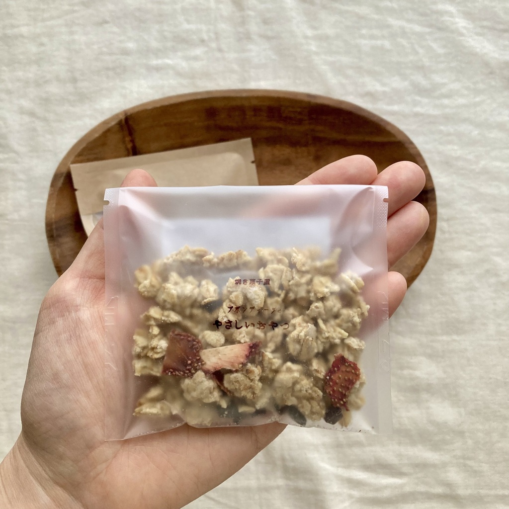 【原材料】 有機オートミール(有機オーツ麦(アメリカ産))、栽培期間中農薬不使用米粉(米(福岡県産))、菜種油(農薬不使用菜種(熊本県産))、有機ココナッツオイル(フィリピン産)、有機チョコレート(アリバ種カカオ100%)(エクアドル製造)、栽培期間中農薬不使用ドライイチゴ(苺(岡山県産))、自然海塩(五島列島)