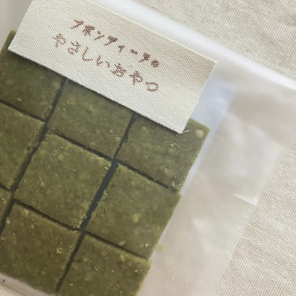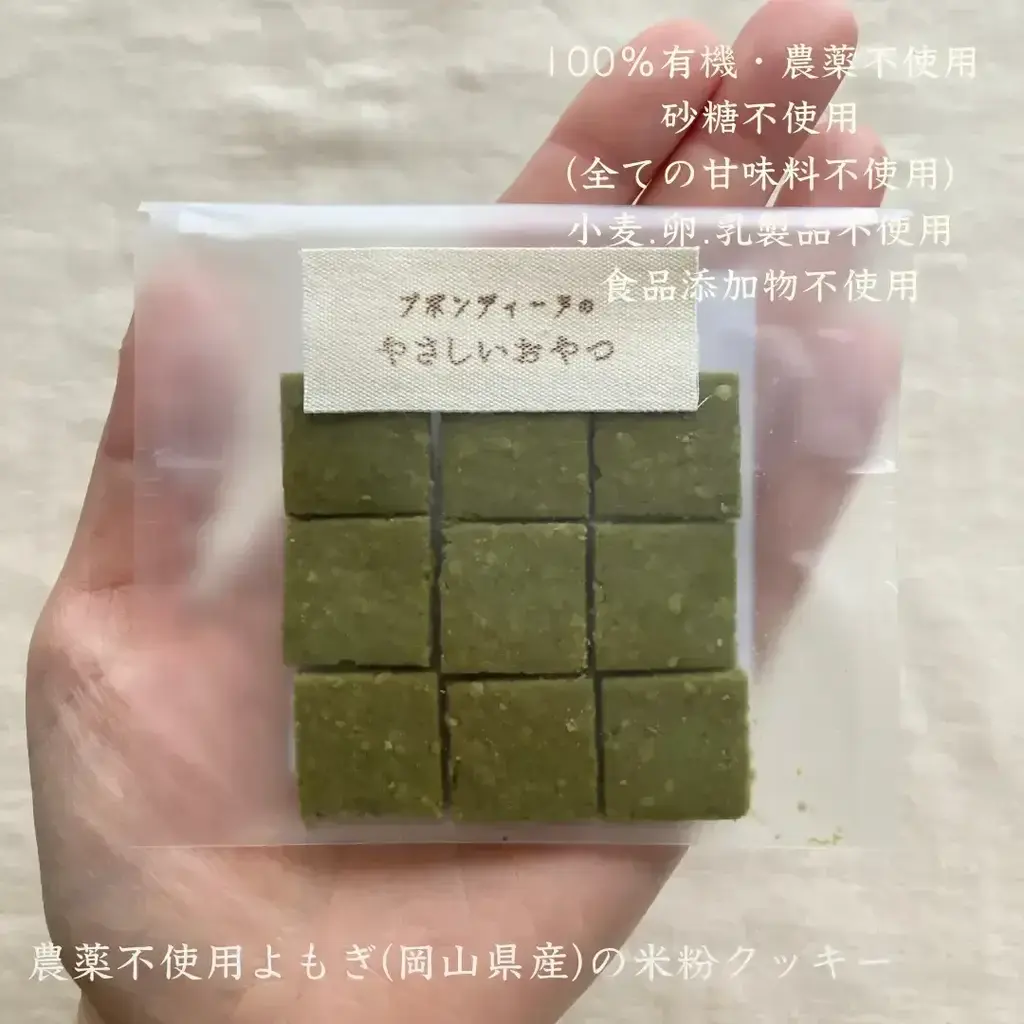 【原材料】:栽培期間中農薬不使用米粉(米(福岡県産))、有機オートミール(アメリカ産)、有機片栗粉(北海道産)、有機アーモンドプードル(アメリカ産)、有機ココナッツオイル(フィリピン産)、菜種油(農薬不使用菜種(熊本県産))、栽培期間中農薬不使用よもぎ茶(岡山県産)、自然海塩(長崎県五島列島)、(一部にアーモンドを含む)