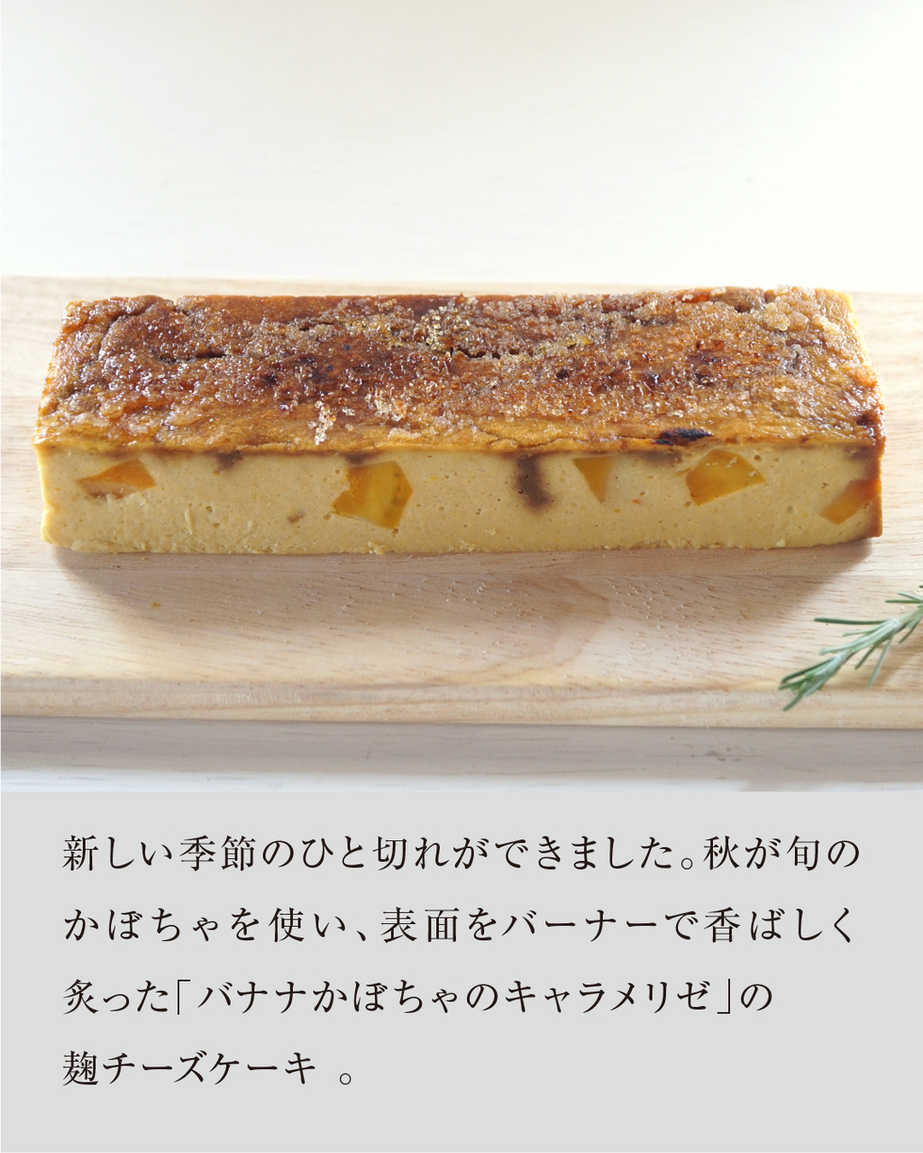 新しい季節のひと切れができました。「麹チーズケーキ バナナかぼちゃのキャラメリゼ」。