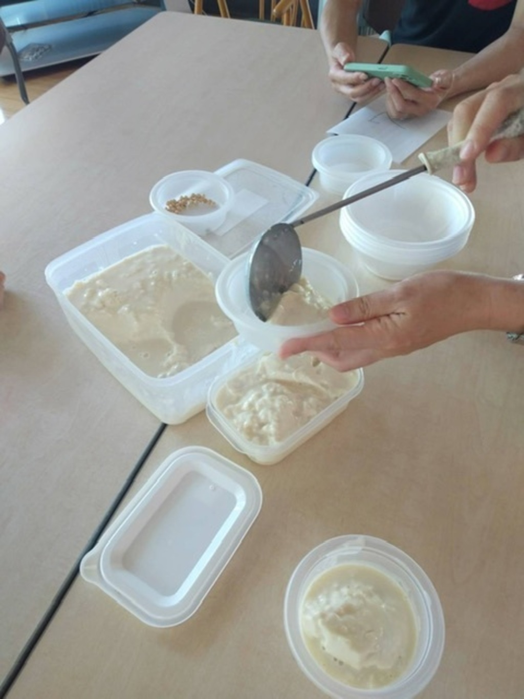 紙芝居後の実食では、 少し固まりが弱かったのですが、温かくてフルフルのお豆腐に、 お醤油やポン酢だけでなく餡子トッピングをお勧めしたら、 子供達が次々に、餡子を取りに来ました。