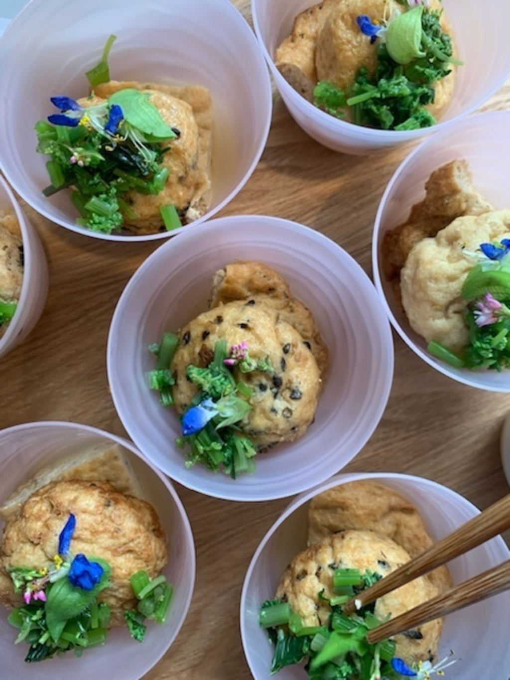 今回のメニューは 🌿ひと口野草おでん(ミゾソバ、ツユクサ、アオミズ) 🌿冷奴 野草麹&野草塩かけ (お豆腐2種盛りに7種の野草麹とイヌタデ塩をそえて) 🌿酵素玄米ごはんと野草佃煮(ヨモギの佃煮) 🌿お味噌汁(アオミズの葉、ミゾソバ、ミゾソバの花、イノコヅチ) 🍮黒糖寄せ豆腐ぷりん(黒千石大豆きな粉をかけて)