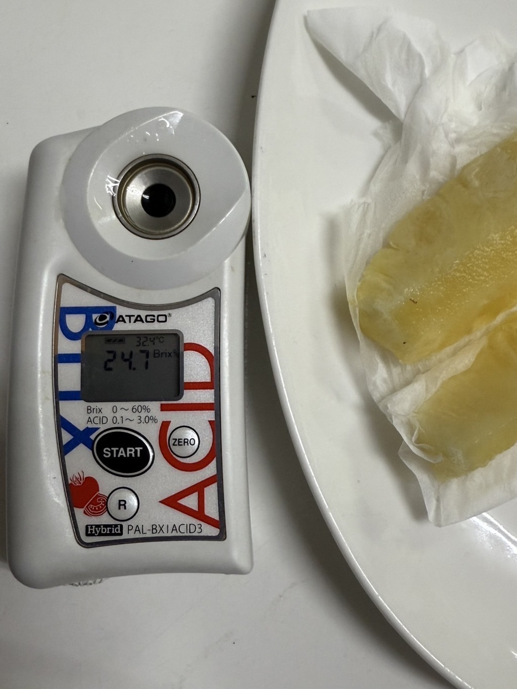 昨年の糖度を4度も上回り、なんと「24.7度」 近頃、ハワイ種が甘くて甘くて、20度は超えているなーと思いながらパクパクと食べておりましたが、まさかの数値に驚きました‼️