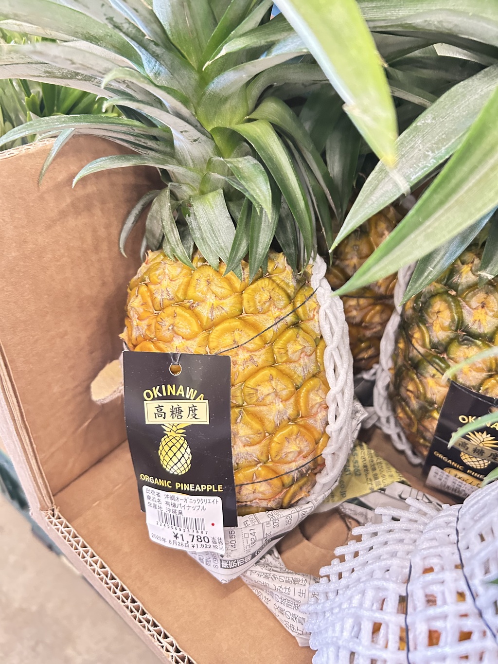 さて、こちらの写真は、 「高糖度」のタグがついた当農園のパイナップルです。 沖縄県内のデパートや、オーガニック系の食品を取り扱うお店などで販売される時の姿です😊