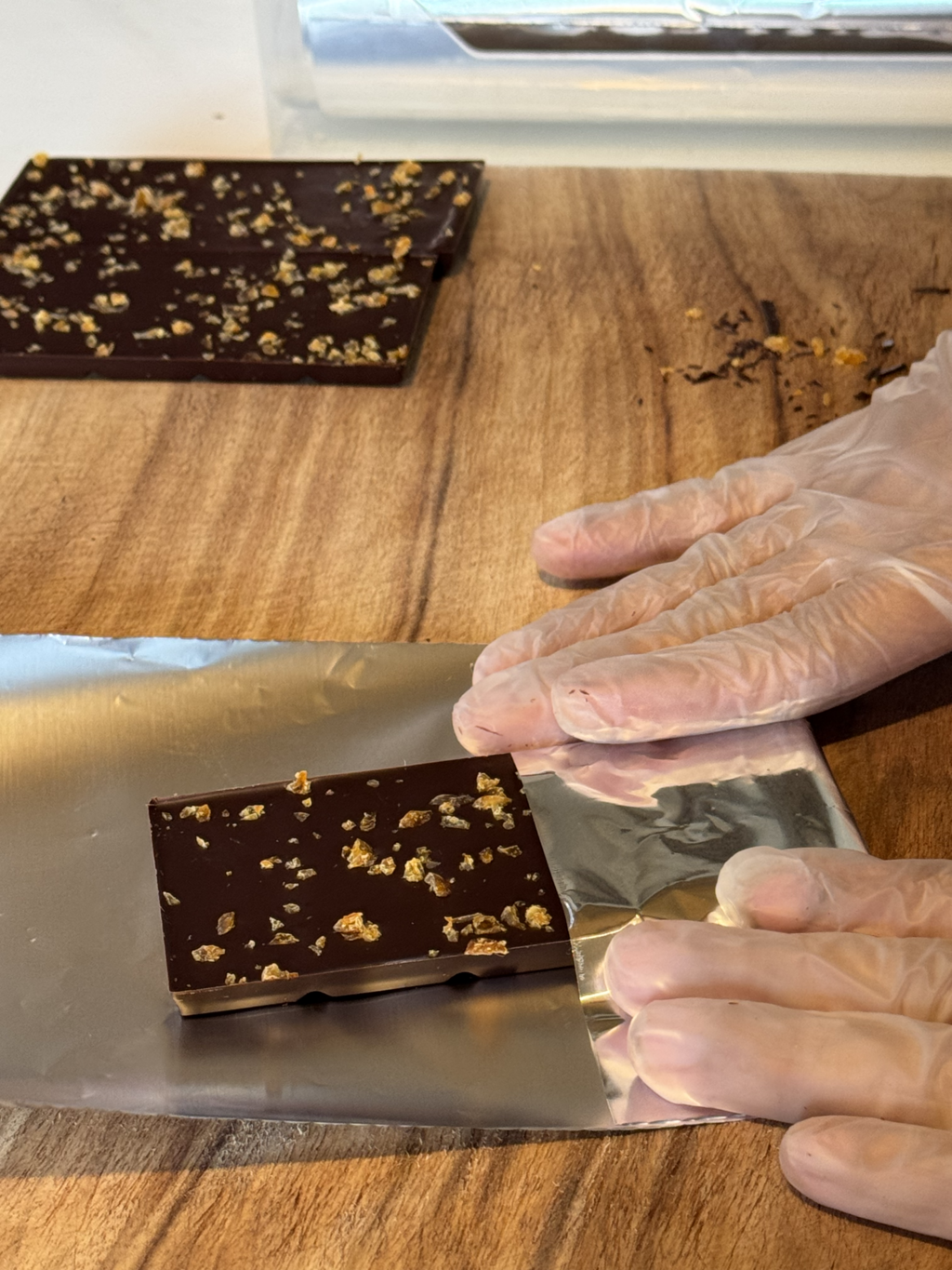 写真にあるのは、出来上がったチョコを包装しているところです。 銀紙でくるんで、その上からオリジナルのパッケージで包む。たったそれだけの工程ですが、これが意外と奥が深いんです。