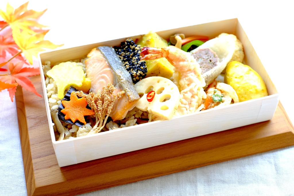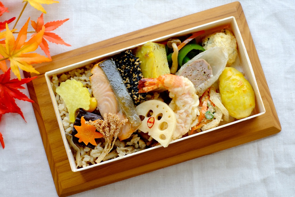 ◎きのこの炊き込みごはん 丁寧に笹がきしたごぼうやきのこ、 鶏肉を炊いた煮汁とともに炊き上げました。 鹿児島県枕崎産のかつお節と、 北海道産の昆布の出汁をたっぷり合わせています。 秋らしい飾りは、イチョウの形のさつま芋と、 もみじの形の人参、昆布の素揚げ🍁 秋の実りをイメージして ごぼうとけしの実で稲穂を表現しました🌾 秋の味覚と彩りを楽しみながら ほっこりした季節の味わいが広がります。