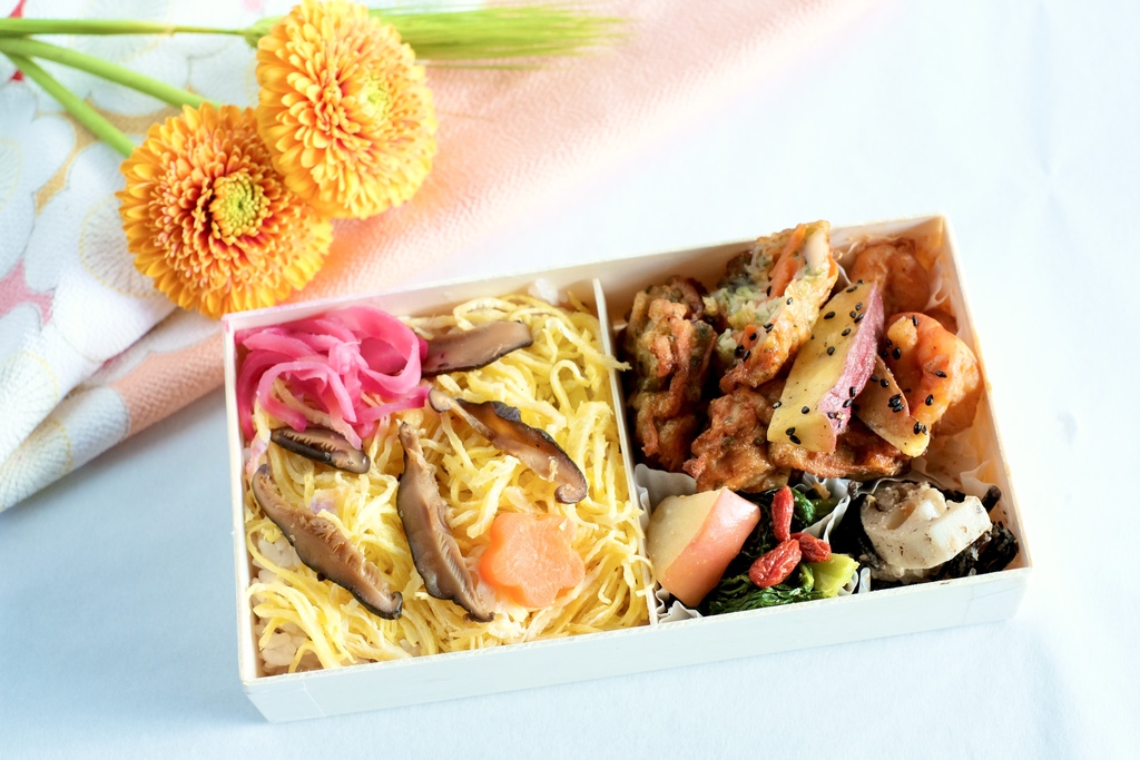 ◎おしながき ・お野菜たっぷりさつまあげ ・海老のピリ辛炒め ・かつお菜とりんごの塩麹和え ・さつまいもスティック ・伊達巻風玉子焼き ・ちらし寿司 ・さつま芋の天ぷら