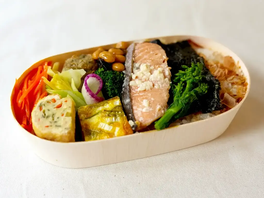 うぶすなの春の「本気ののり弁」は 北海道産鮭をうぶすな自家製の「レモン塩麹」に漬けてじっくり焼き上げました。 爽やかなレモンが香り、ほろほろやわらかく口の中でほどけます。