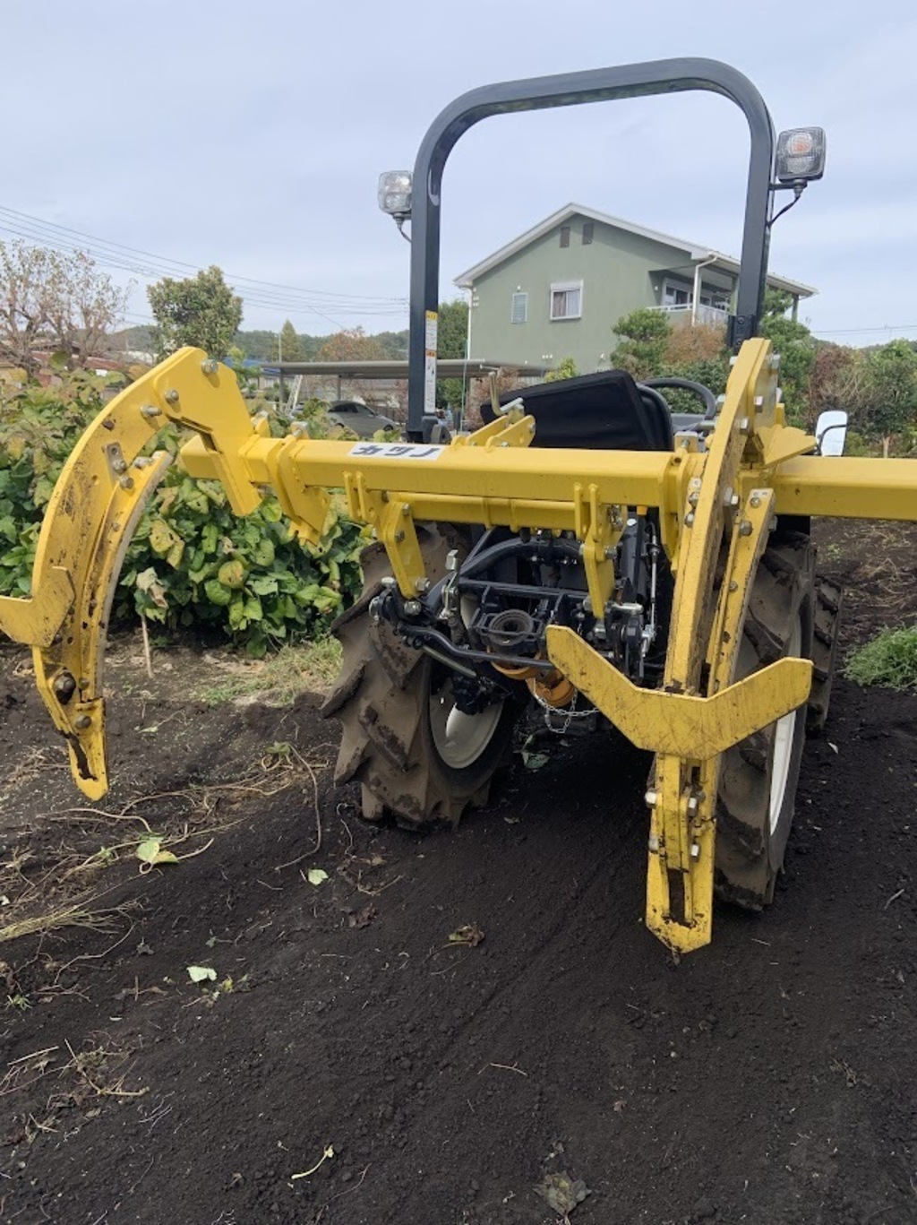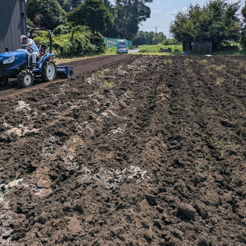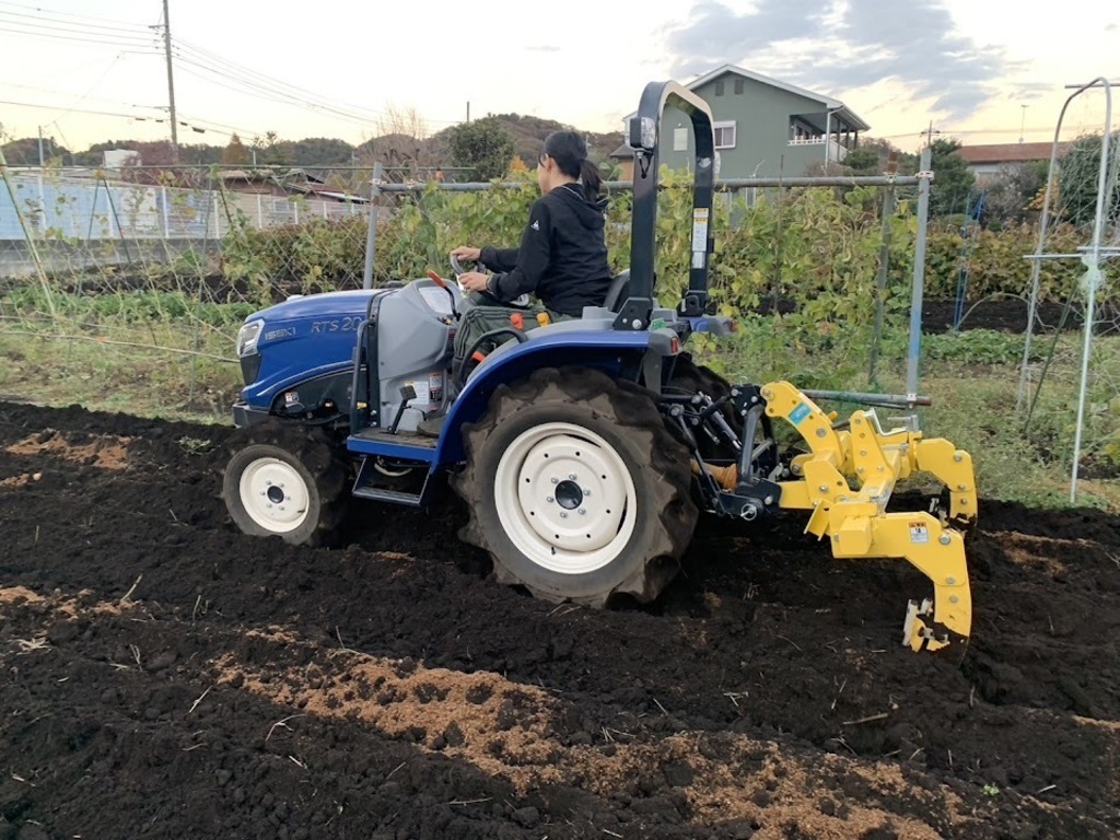 畑にぼかしを撒いたらトラクターの後ろに「プラウ」(大きな爪のようなもので深堀するためのアイテム)で土の中に「もみ殻ぼかし」を混ぜていきます。