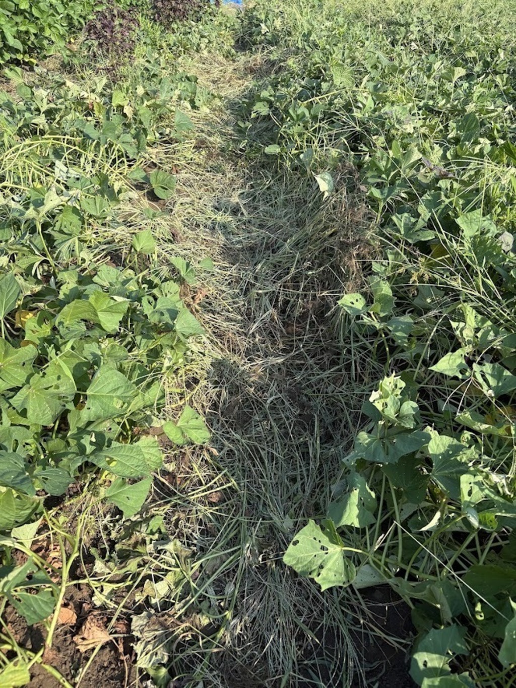 「つる返し」をした様子です。つるを伸ばしたままにしていると地面についたつるの節から芋をつけようと根を張り始めます。根を張ることに力を注がれてしまうと本体のお芋の育ちが妨げられることがあります。それを防ぐために蔓返しをおこないます。