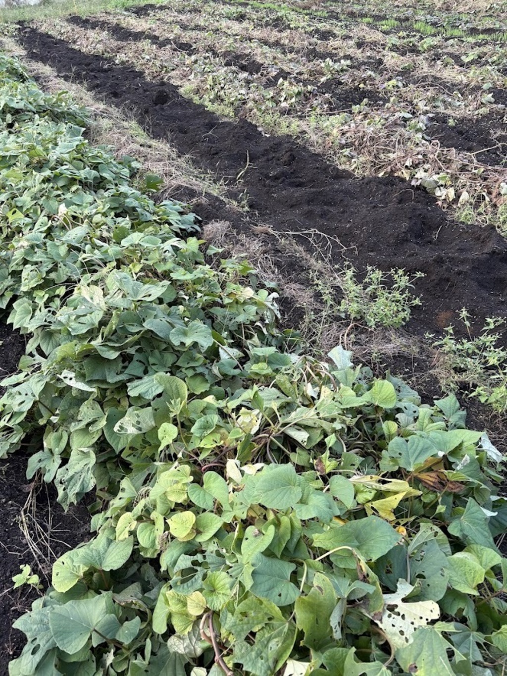 さつまいも収穫後の畑には蔓がたくさん残っています。多くの農家は蔓を畑の端へ寄せて片づけ、その後トラクターで耕します。