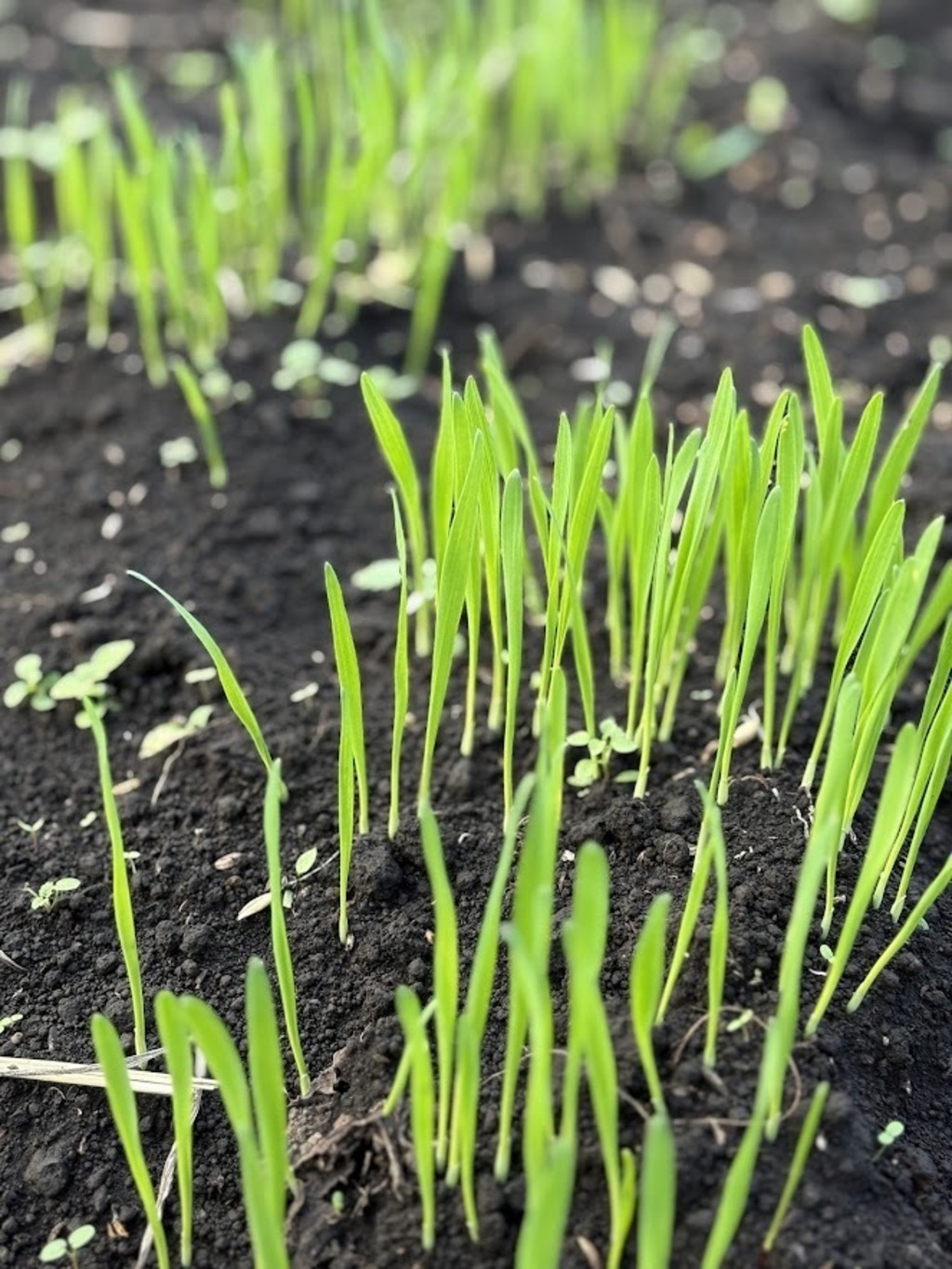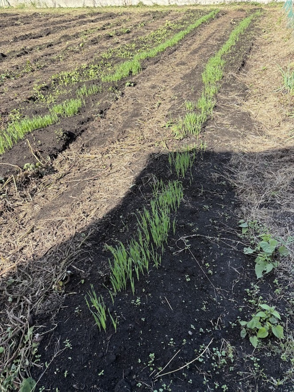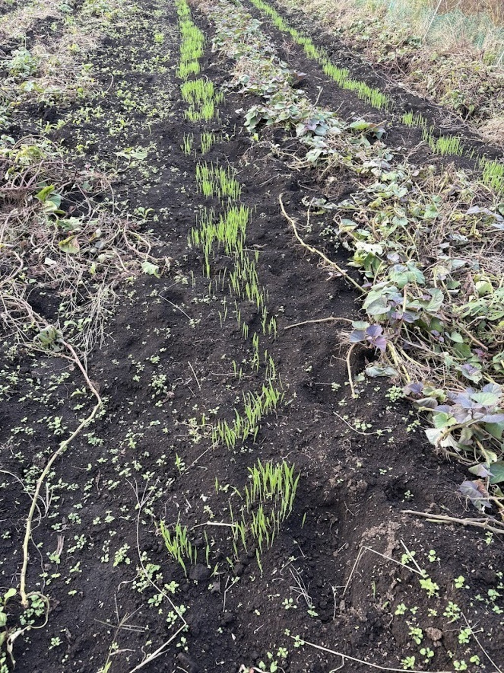 サツマイモ収穫後には「エンバク」という麦の種をまきます。上の画像は発芽したばかりの「エンバク」です。ある程度大きくなったら、土の中にすき込みます。さつまいもが好物の「センチュウ」の増殖を防いでくれます。そして緑肥としての効果もあります。年内にトラクターですき込みます。
