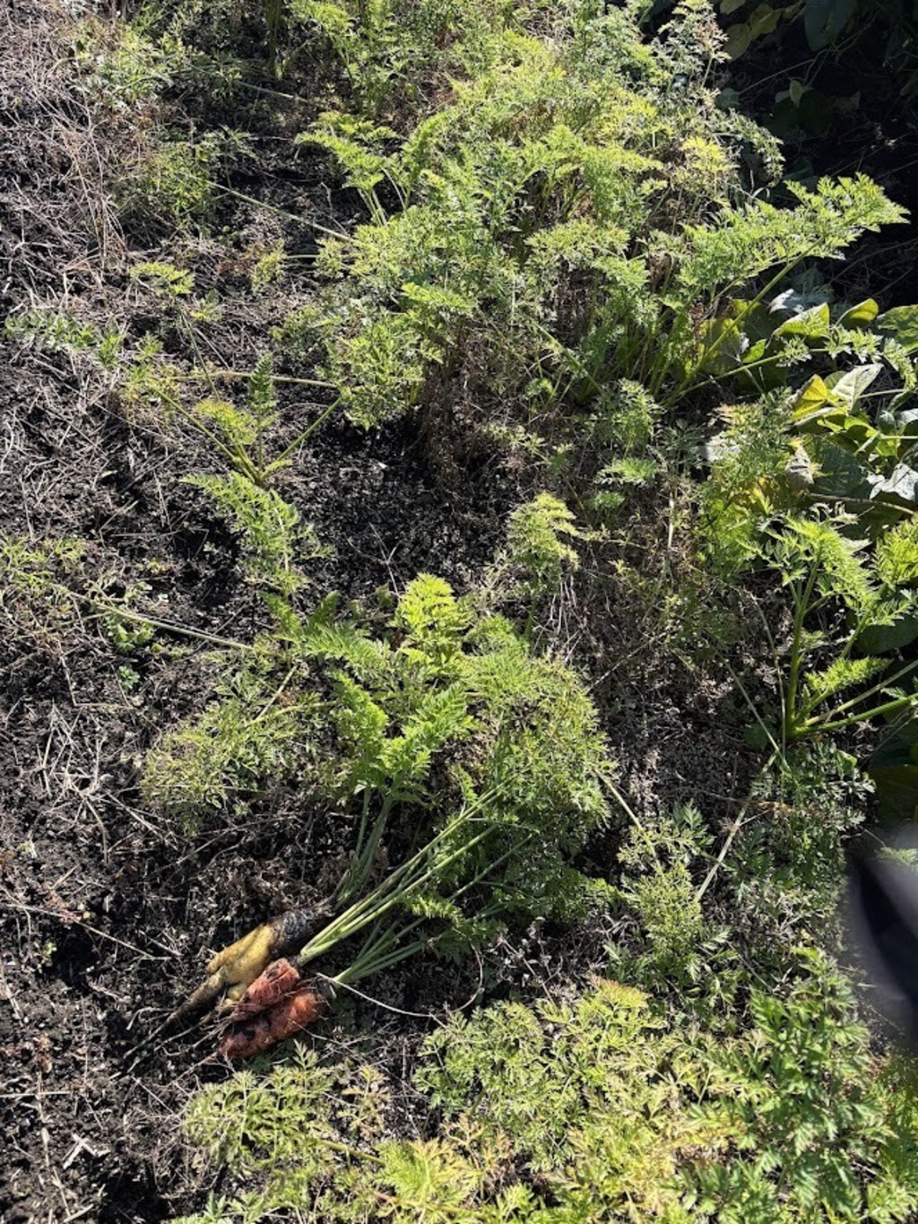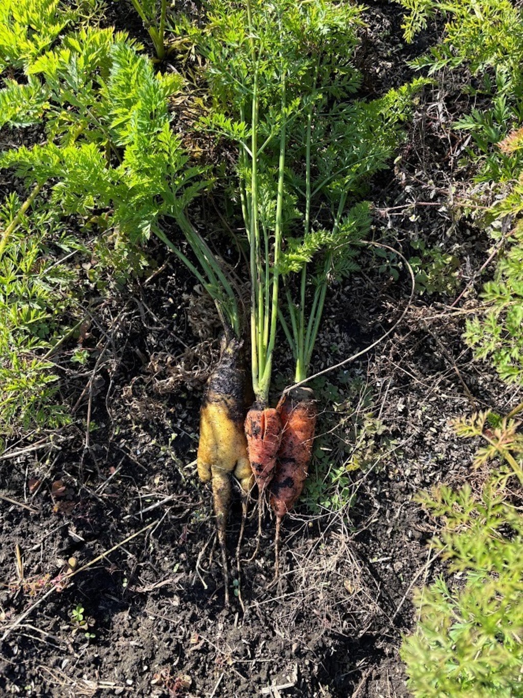 7月頃に種まきしたものです。雨が降らない時期が長く、小さく、更にひびが入ってしまいました。黄色の人参もサラダの彩りに貢献してくれます。葉は刻んでチャーハン、スープの上に利用しても美味しいです。