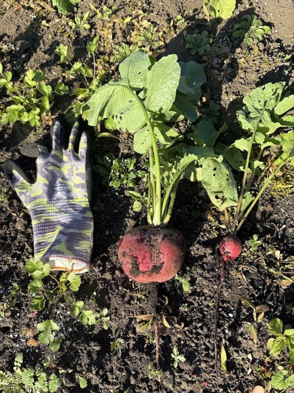 左の大きな「おばけラディッシュ」7月頃に種まきしたものいつの間にかこんなに巨大化していました。赤大根のようです。右は普通サイズのものです。