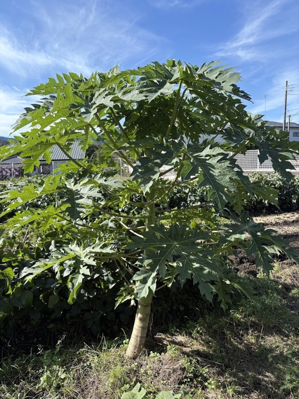 畑のシンボルツリーのようなパパイヤ。南国の風が吹いてきそうです。小さな実をつけています。冬が来たら枯れてしまうと思いますが、初夏からずっと楽しませてもらいました。