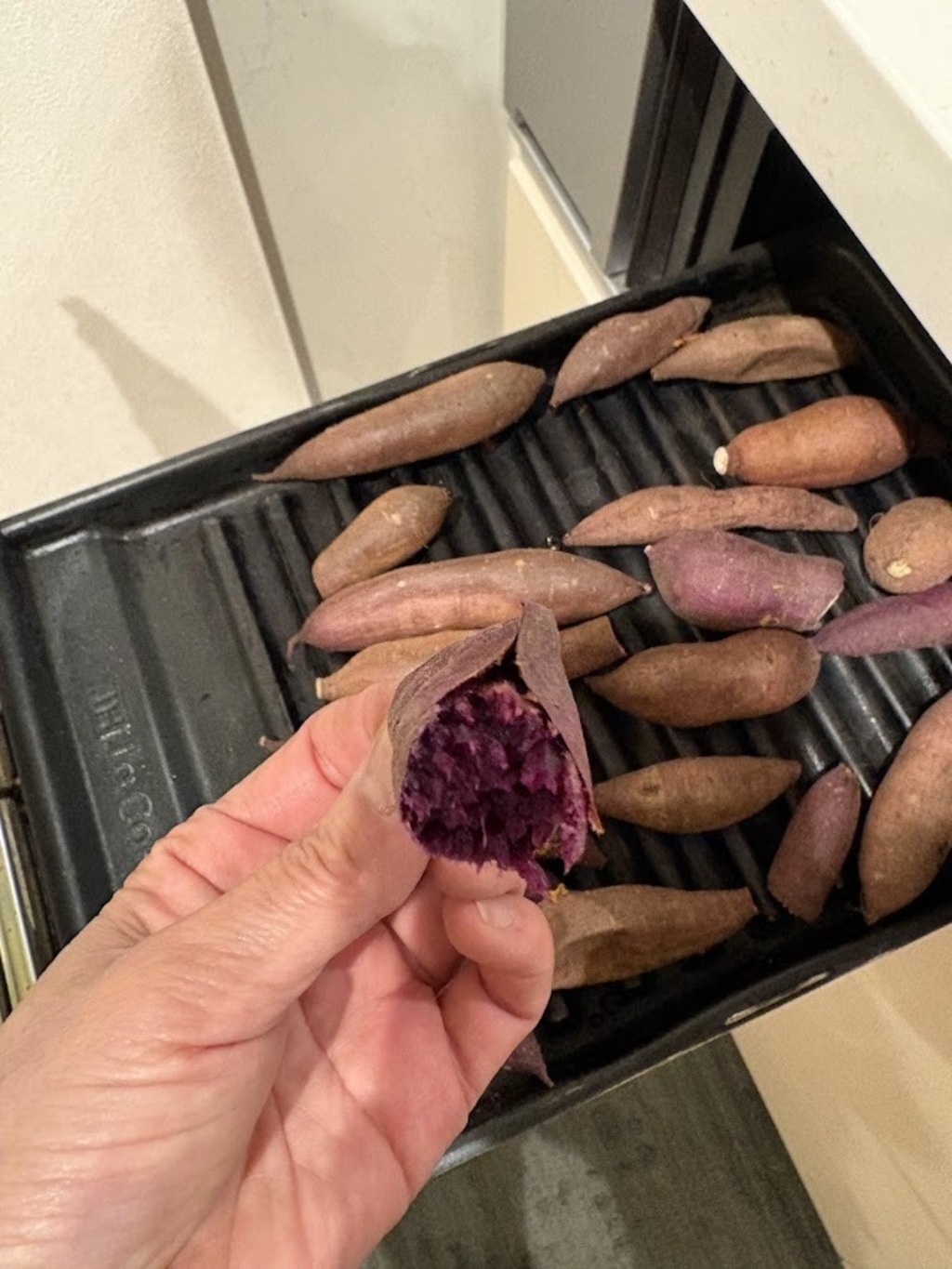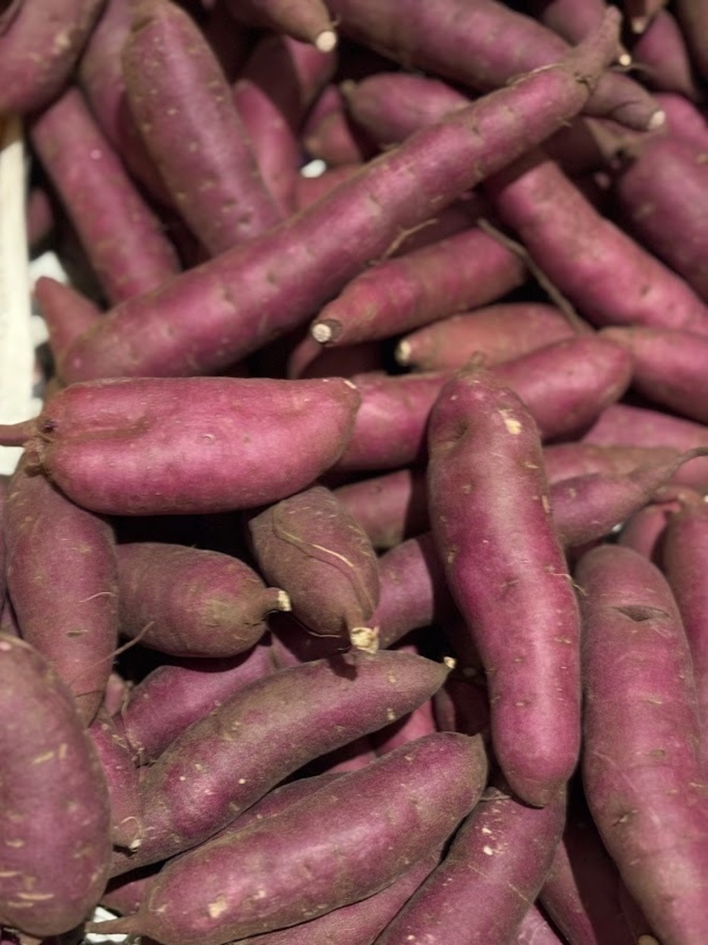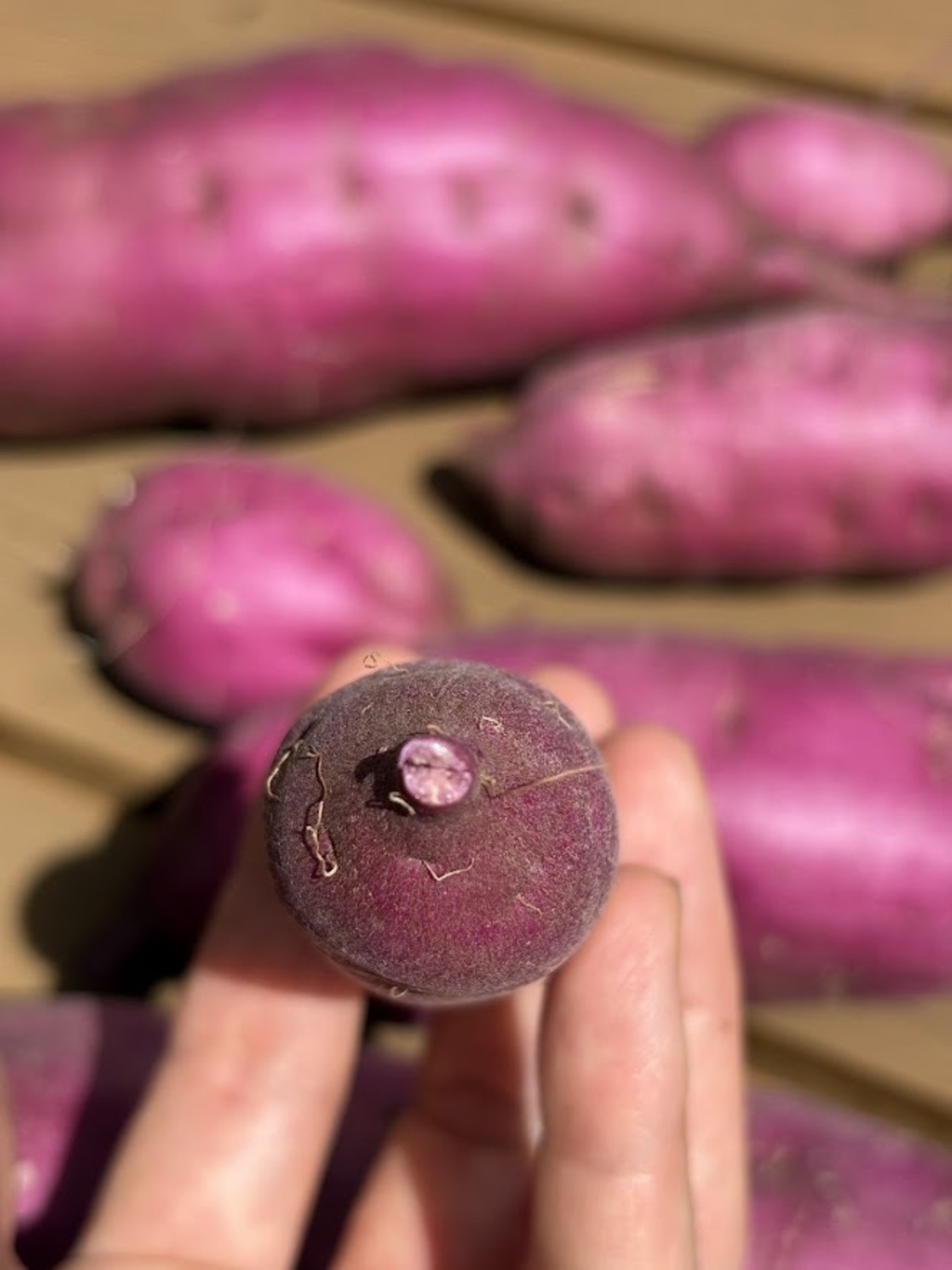 パープルスイートロード(紫芋)は収穫直後はホクホクしていて甘さも控えめです。焼き芋にすると水分が少なくて飲み物が欲しくなる感じです。しかし、収穫後3ヶ月たつと、オーブンで160℃、120~240分(大きさによって時間調節してください)焼くとねっとり甘味が強くなっていました。