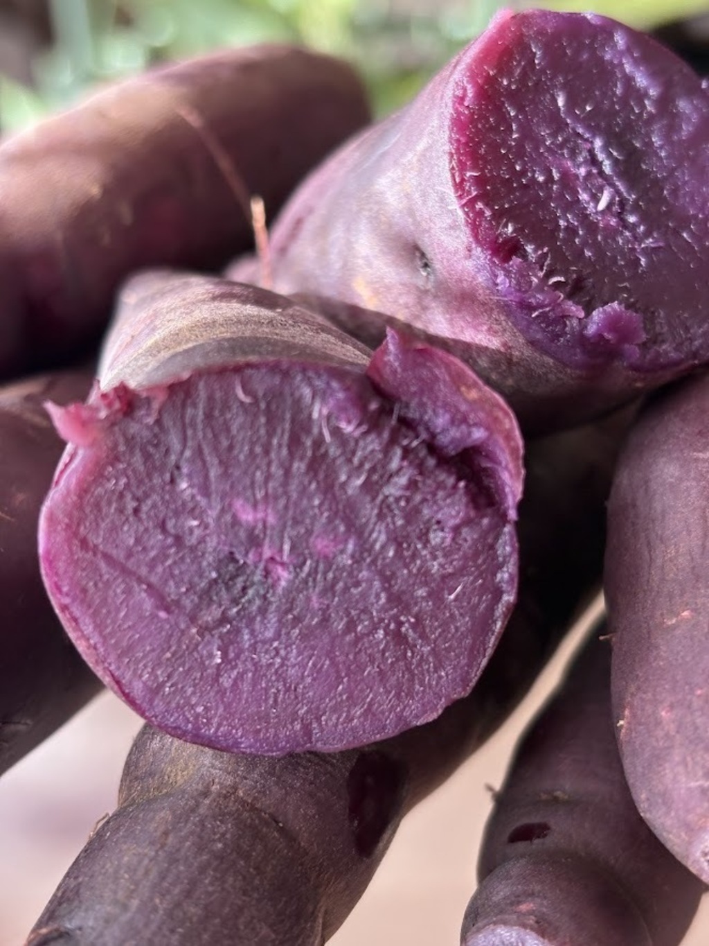 蒸かしたり焼いてみたり、ペースト状にしてパンに練り込み、いろいろ楽しんでください。鮮やかなパープルカラーは紫芋ならではです。