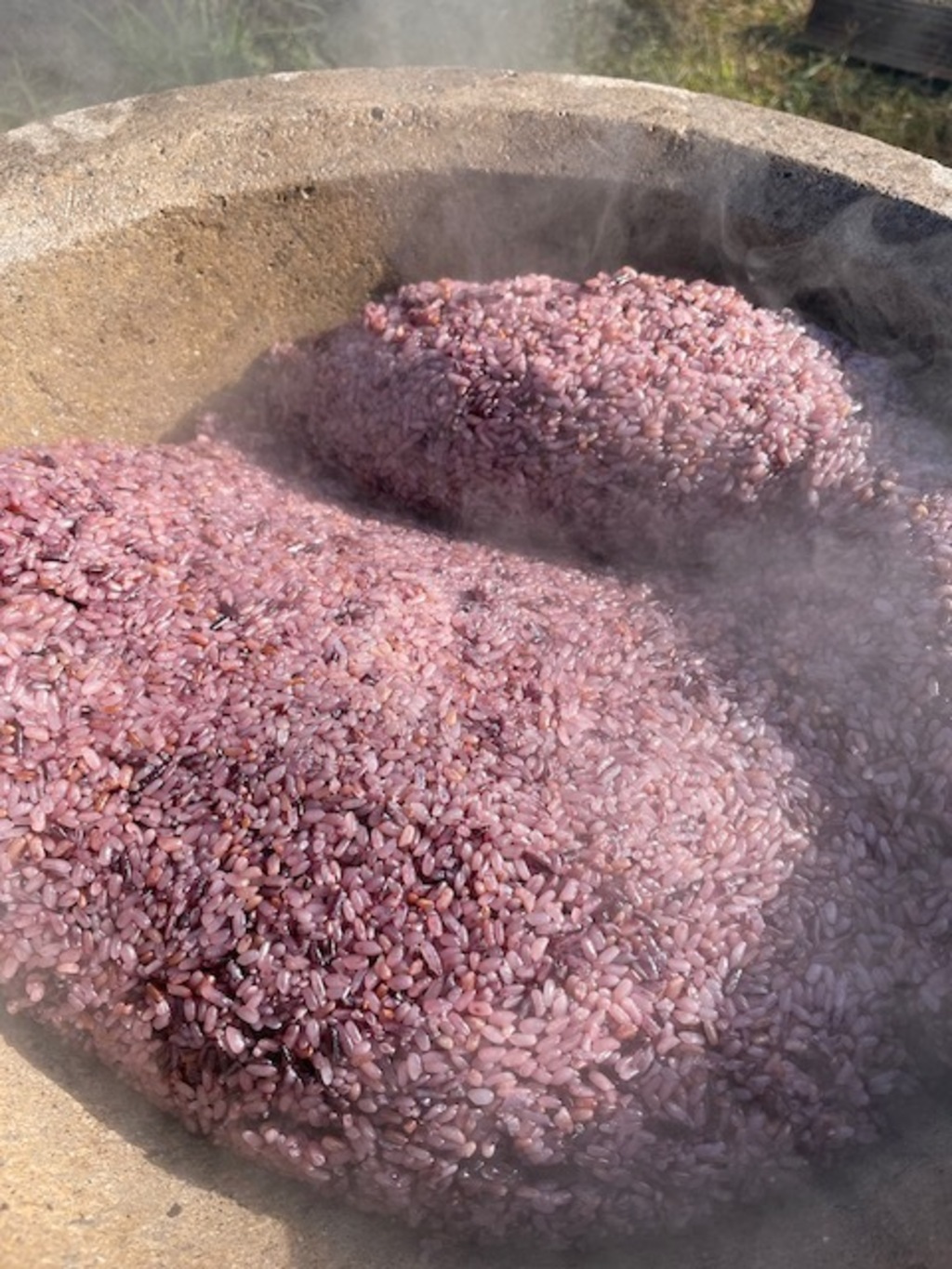 搗く直前の古代米のもち米。黒米と赤米の色が出てます。黒米の香りも特徴ですし、もちろん緑米の甘味、うま味も出ています。