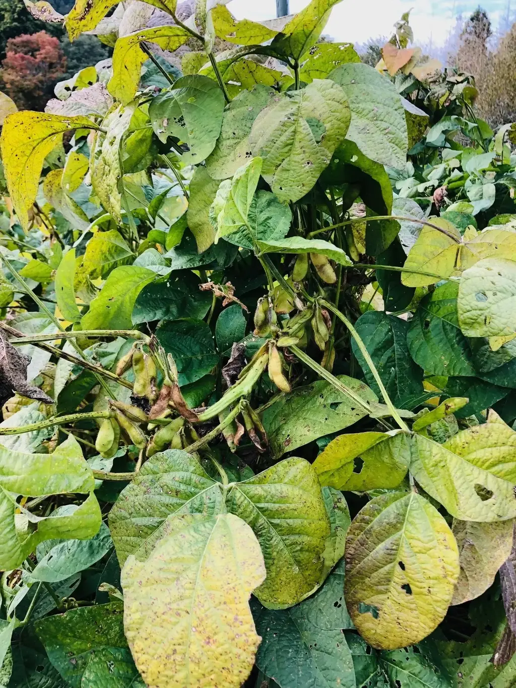 錦秋の時期を迎え、畑の大豆もそろそろ収穫が近づいて参りました。今年は丹波黒大豆、津久井大豆、里のほほえみの三種類を撒いてみましたが、里のほほえみは今夏の猛暑が影響したのか不作です。殆ど実が入っておりません・・・(-_-;)丹波と津久井は何とか頑張ってくれたようで、ある程度販売出来るくらいの量は収穫出来そうで安心しました。
